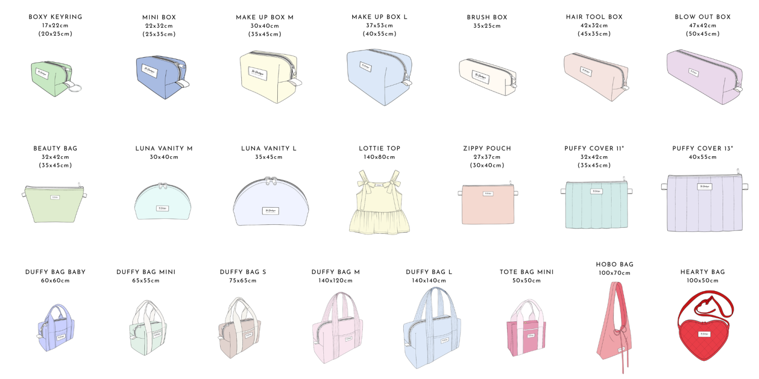 Här ser du alla mönster och vilken storlek på tygark som passar bäst. Om en storlek är slut i lager så passar alltid ett större ark till ditt mönster, tänk på att bredd står först (bredd X längd). T.ex. Beauty Bag och Hair Tool Box är samma storlek på tygark men med två olika riktningar och funkar för båda om tyget t.ex. är enfärgat. Alla tygark är mönsterpassade och klippta med några cm marginal för att du ska få ut ditt mönster utan onödigt spill. Måtten inom parentes är från framsidan av din mönsterförpackning och passar ännu bättre med lite större marginal, för säkerhets skull!