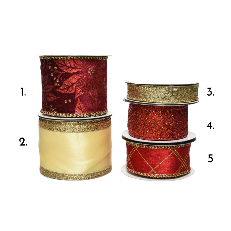 Det är enkelt att knyta rosetter med dessa dekorativa band som har insydda ståltrådar i kanterna. Välj band i listan - se siffrorna på bilden. Mer information om varje band i produktbeskrivningen nedan.