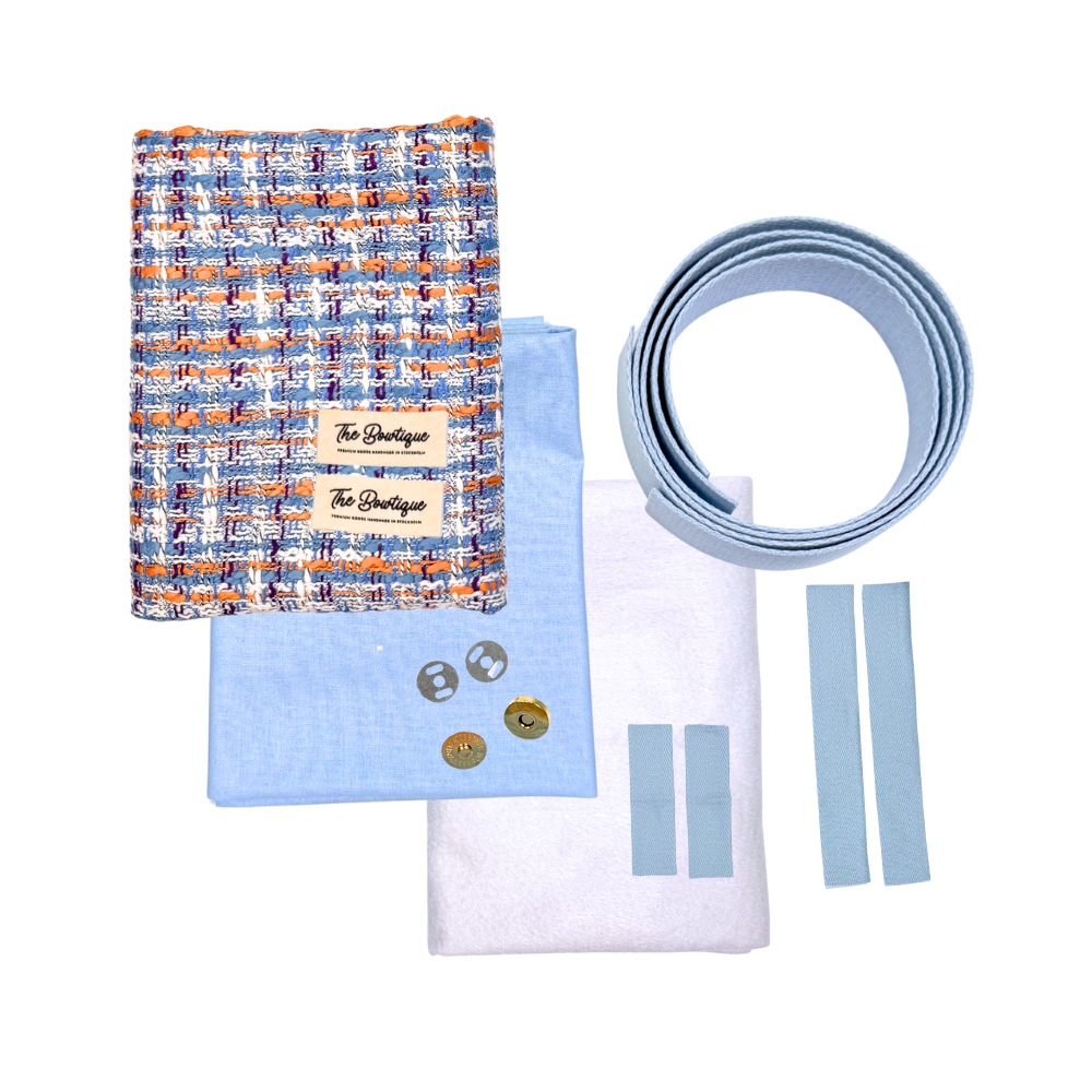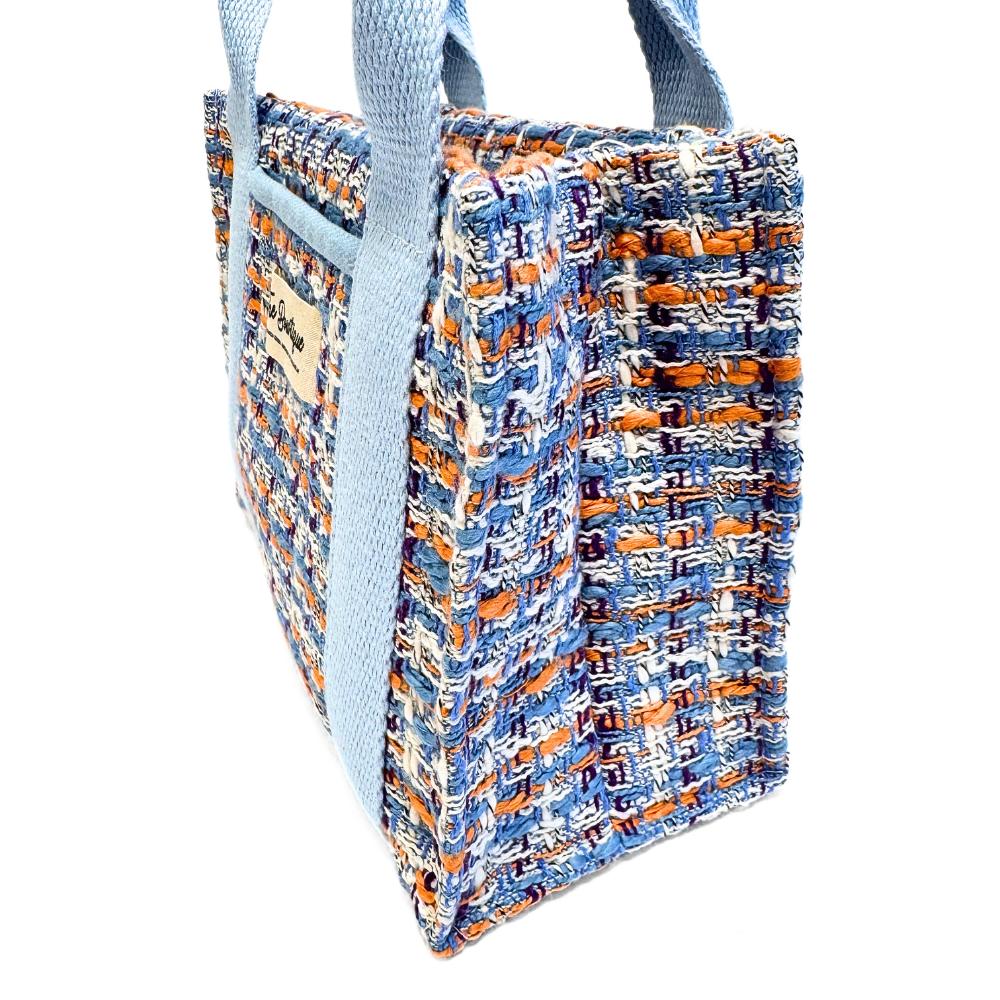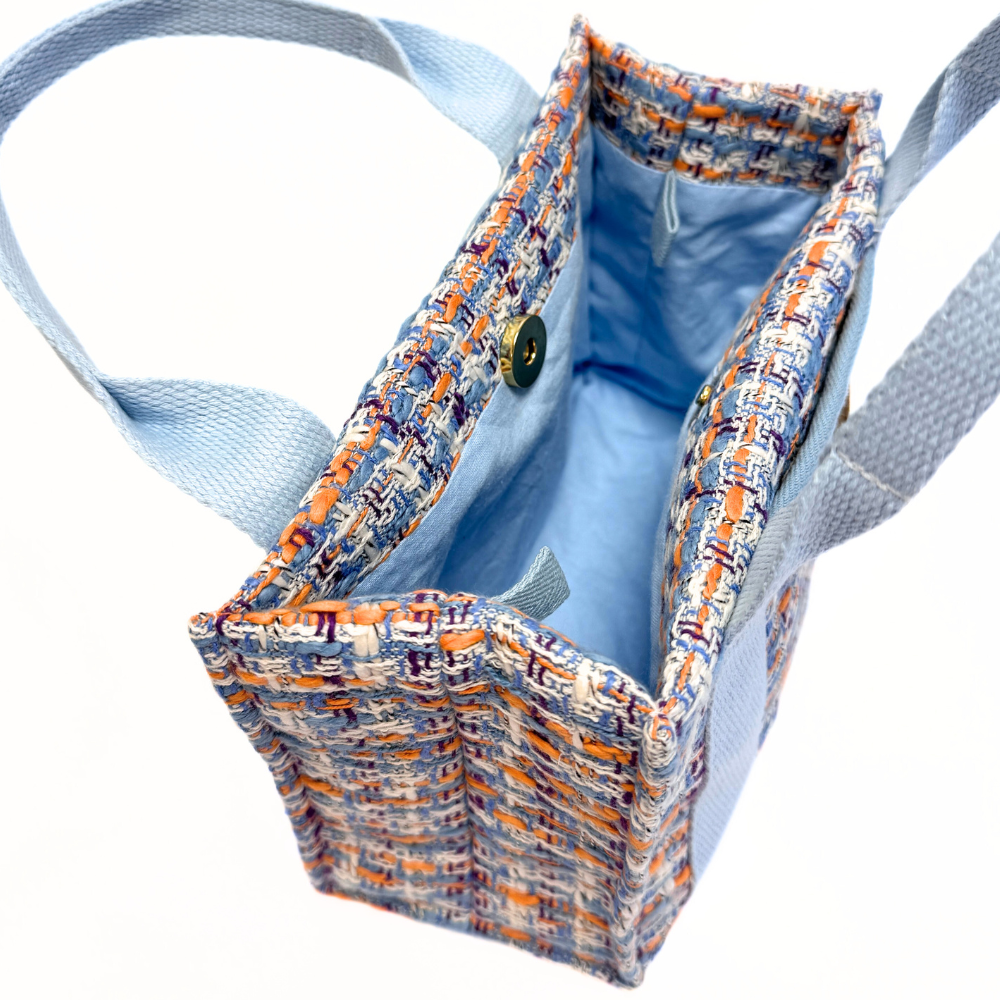 Tillklippta delar så du endast köper exakt det du behöver för att kunna sy denna söta handväska i äkta Chanel tyg i ljusblått, orange och lila på cremefärgad botten i 100% bomull. Färdigt mått på din sydda väska är 20x15x9cm. Köp mönstret Tote Bag Mini här