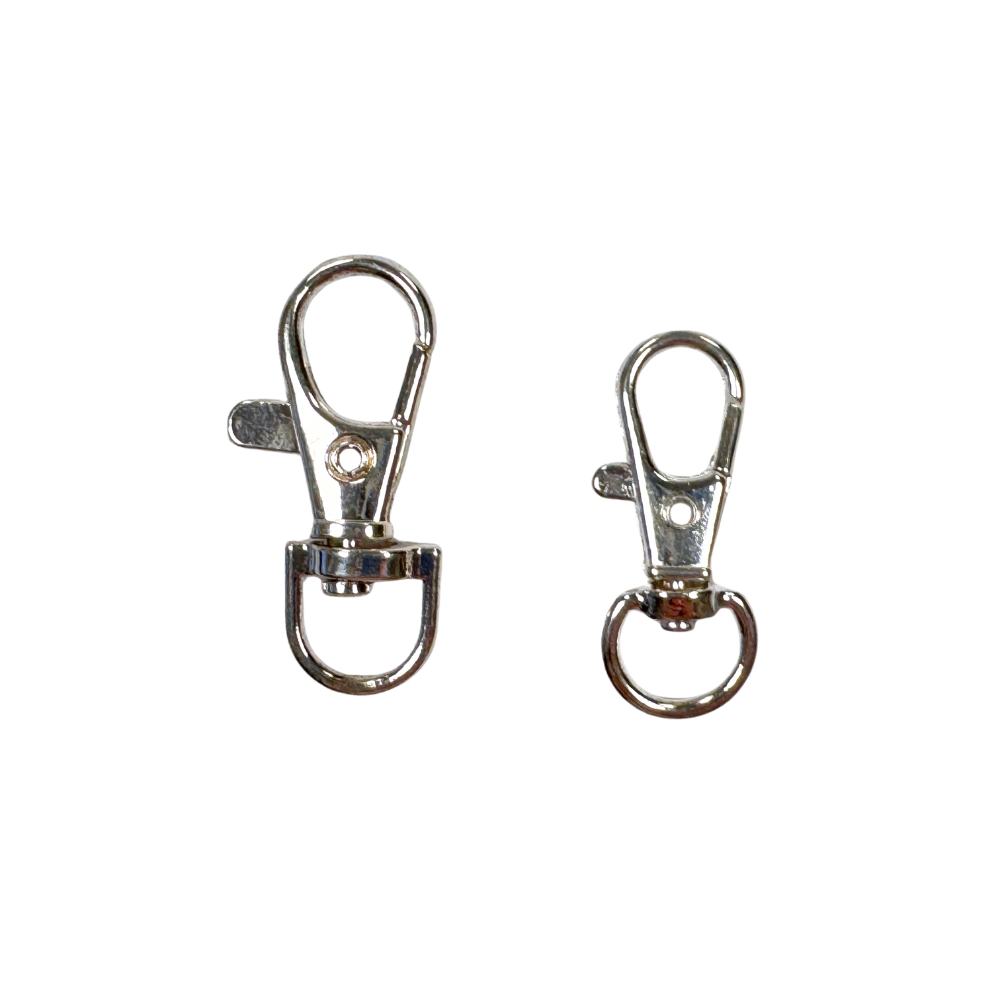 Hummerlås med klämma och vridbar ring att fästa i snodd eller klicka i en metallögla för nyckelring eller rem till väska. Säljes per styck. Lilla 33mm lång. Stora 38mm lång.