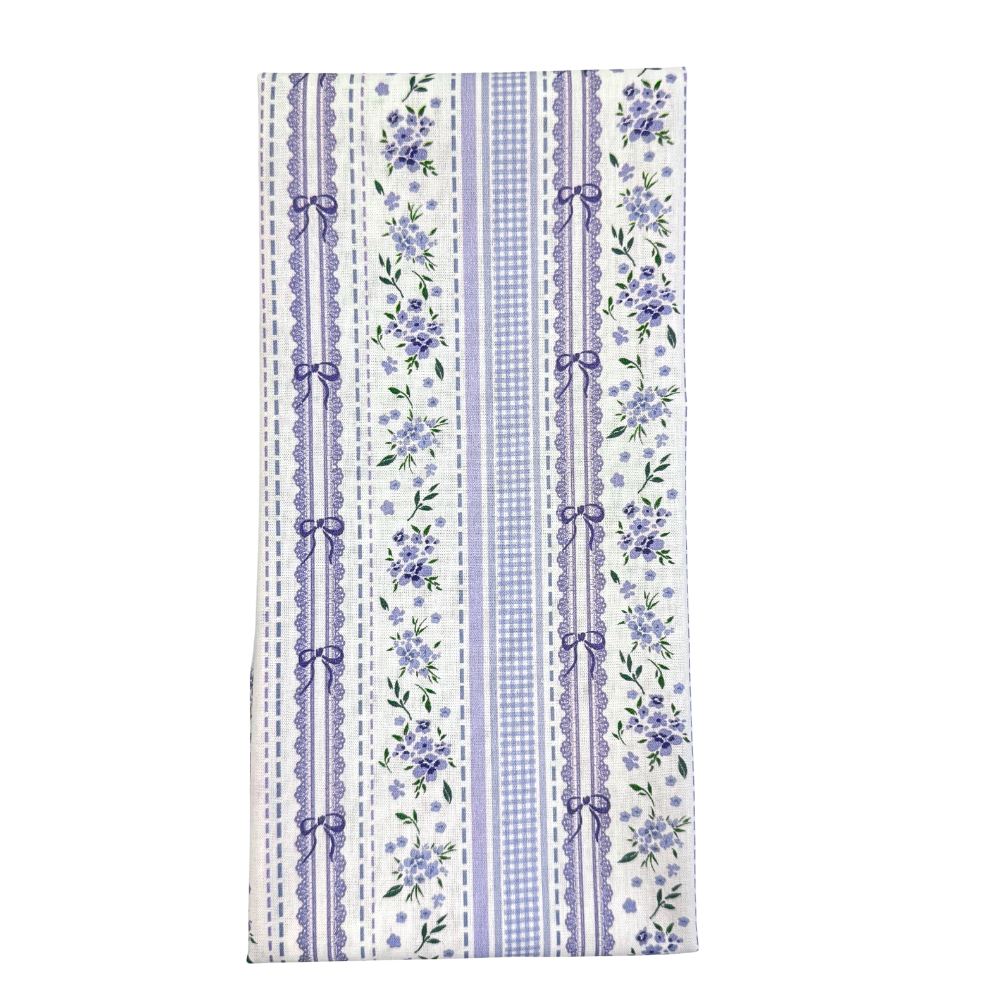 Färdigklippta tygark som passar till The Bowtique's egna mönster med necessärer och väskor. Florals & Bows är ett fint vävt tyg i 100% bomull med söta ränder, rosetter och blommor i lila och ljusblå. Finns i begränsat antal.
